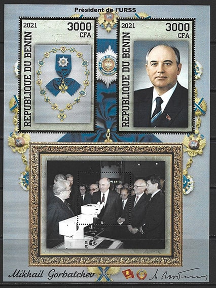 Бенин 2021 год. Михаил Горбачев. Москва 1988 год. Презентация накопителя данных на 1 мегабайт. Малый лист, тиснение золотом