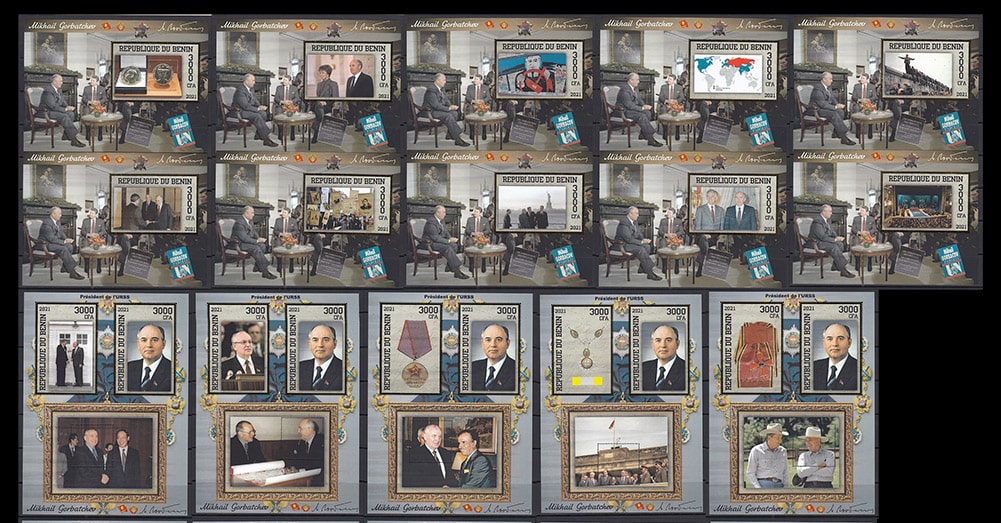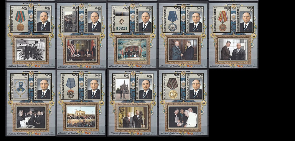 Бенин 2021 год. Михаил Горбачев, золотая рамка, 10 б/з блоков, 14 малых листов