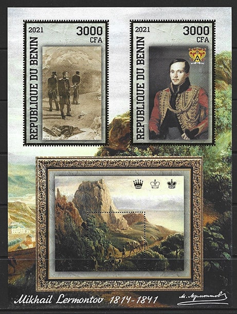Бенин 2021 год. Михаил Лермонтов, малый лист, тиснение золотом