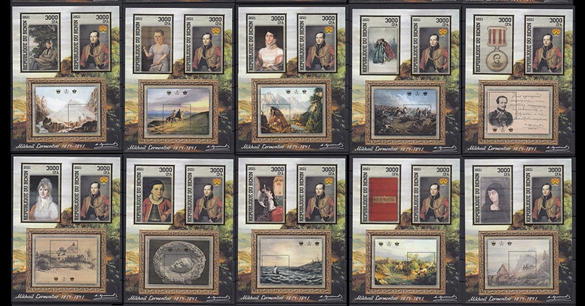 Бенин 2021 год. Михаил Лермонтов, золотая рамка, 8 б/з блоков и 20 малых листов