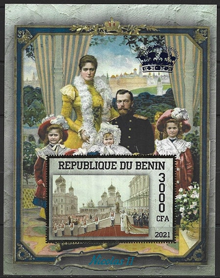 Бенин 2021 год. Николай II, блок, тиснение золотом