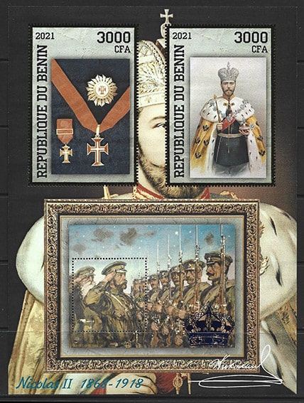 Бенин 2021 год. Николай II, малый лист, тиснение золотом