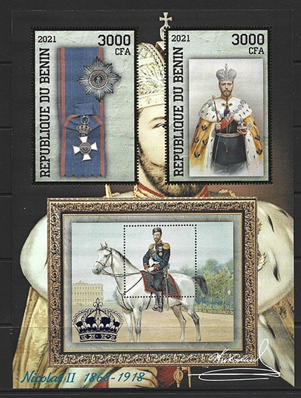 Бенин 2021 год. Николай II, малый лист, тиснение золотом