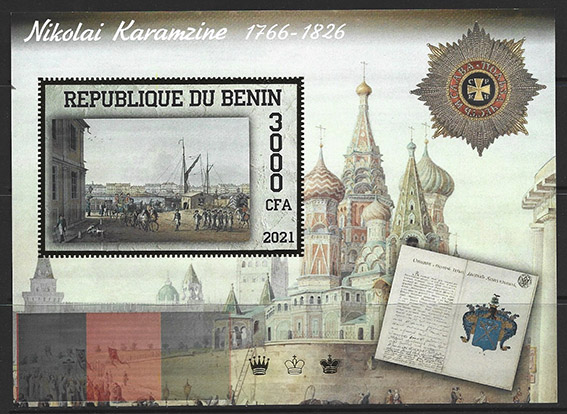 Бенин 2021 год. Николай Карамзин. Картины. Живопись. Беззубцовый малый лист, тиснение золотом