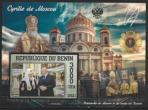 Бенин 2021 год. Патриарх Кирилл и Сергей Лукашенко, блок, тиснение золотом