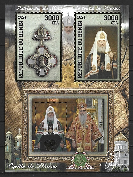 Бенин 2021 год. Патриарх Кирилл, малый лист, тиснение золотом