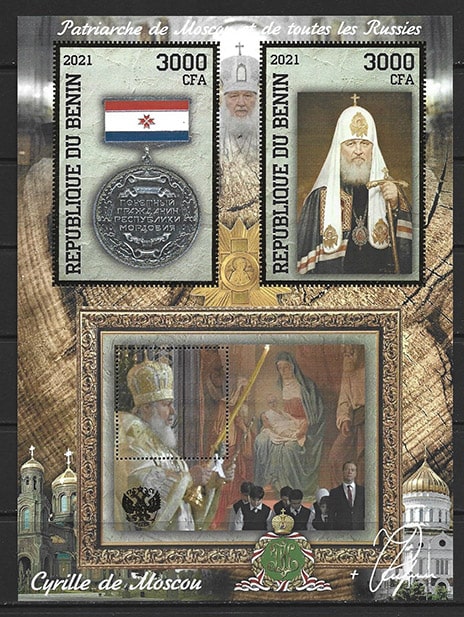Бенин 2021 год. Патриарх Кирилл, малый лист, тиснение золотом
