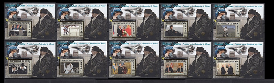 Бенин 2021 год. Президент РФ Владимир Путин , золотая рамка, 10 б/з блоков, 14 малых листов