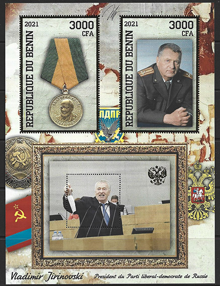 Бенин 2021 год. Владимир Жириновский в Госдуме, малый лист, тиснение золотом