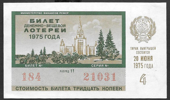 Билет денежно-вещевой лотереи 1975 года. 4 выпуск. 20 июня
