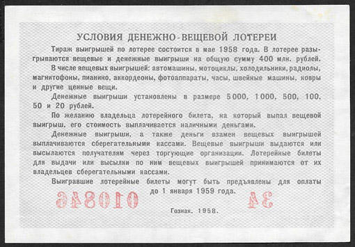 Билет денежно-вещевой лотереи. 5 рублей, 1958 г.