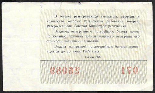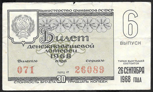 Билет денежно-вещевой лотереи. 6 выпуск 26 сентября 1968 год