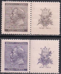 Богемия и Моравия (Рейх) 1941 год. 100 лет со дня рождения композитора А. Дворжака. 2 марки + купоны (купоны справа) 2м