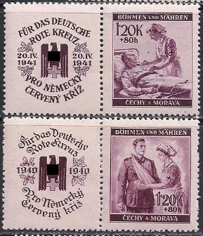 Богемия и Моравия (Рейх) 1941 год. Красный Крест. 2 марки + купоны (купоны слева)
