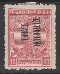 Болгария 1919 год. Западная Фракия. Союзная оккупация. Царь Борис III, ном. 10 St, ндп, 1 марка из серии (наклейка)