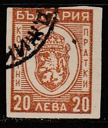 Болгария 1944 год. Герб, ном. 20 L, 1 б/зубц. посылочная марка из серии (гашёная) (1 из 9)