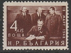 Болгария 1950 год. Подписание договора СССР с Болгарией. Сталин, Молотов, Димитров, Коларов, 1 марка из серии.