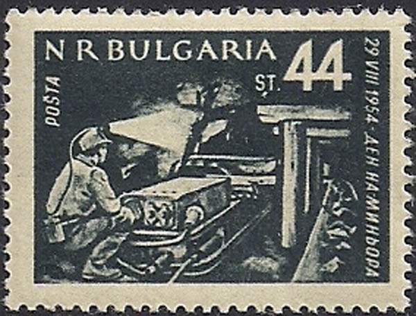 Болгария 1954 год. День шахтёра. Рабочий у подъёмной машины. 1 марка с наклейкой