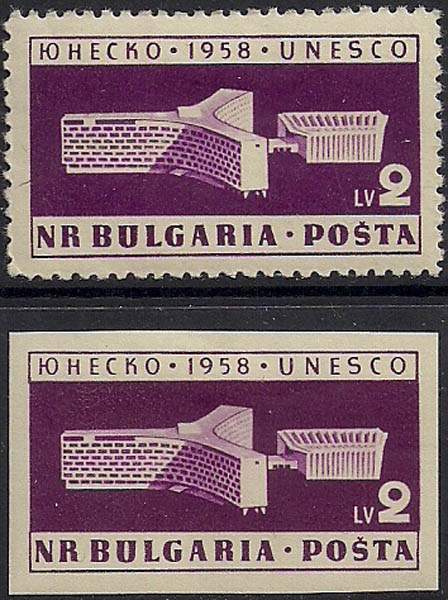 Болгария 1959 год. Открытие новой резиденции ЮНЕСКО в Париже. 2 марки с наклейками (одна - без зубцов)