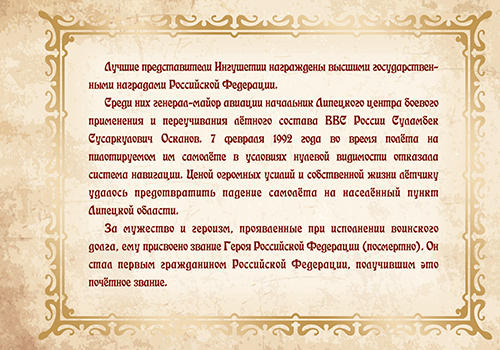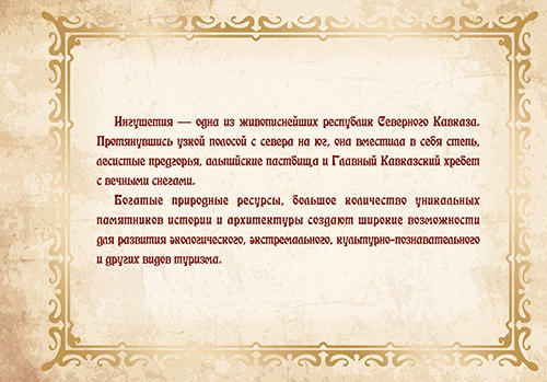 В марочный буклет вошли 5 почтовых марок и почтовый блок, посвящённые историческим и природным достопримечательностям, а также известным деятелям Республики Ингушетия. Это выпуски «Россия. Регионы. Республика Ингушетия» (2009 г.); «Культурно-исторический памятник «Башня Согласия» в г. Магасе» (2014 г.); «100 лет со дня рождения Дж.Х. Яндиева (1916–1979), классика ингушской литературы» (2016 г.); «Гербы субъектов и городов Российской Федерации. Республика Ингушетия» (2016 г.); «Герои Российской Федерации. Продолжение серии. Осканов Суламбек Сусаркулович» (2017 г.); «25 лет Республике Ингушетия» (2017 г.).