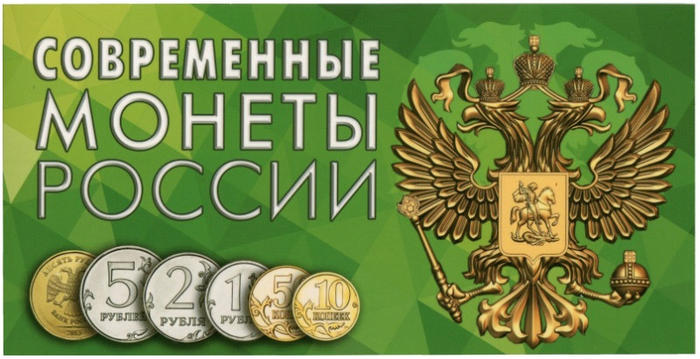 Буклет под современные монеты России, на 8 монет, 90*180 мм, номиналом: 1, 5, 10, 50 копеек, 1, 2, 5, 10 рублей