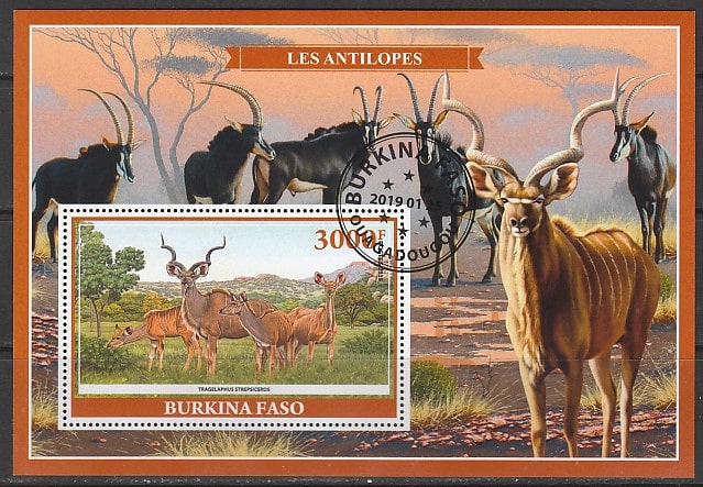 Буркина Фасо 2019 год. Африканская фауна. Антилопы, гашёный блок Сувенирный выпуск.