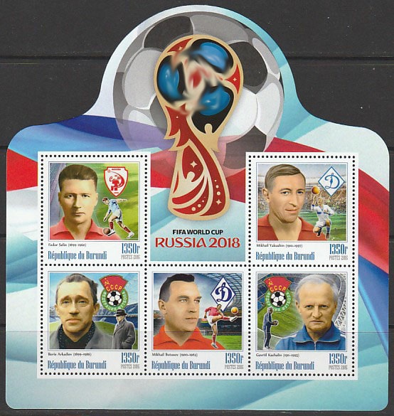 Бурунди 2016 год. ЧМ по футболу в России. Селин, Аркадьев, Бутусов, Качалин, Якушин, малый лист. Сувенирный выпуск.