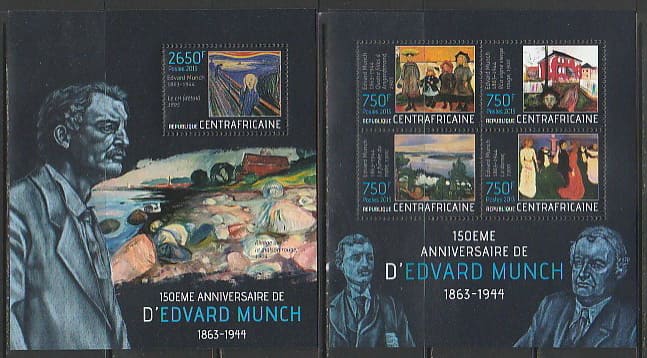 ЦАР 2013 год. Картины норвежского живописца Эдварда Мунка, малый лист + блок.