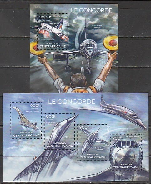 ЦАР 2014 год. Сверхзвуковой пассажирский самолёт "Конкорд", малый лист + блок.
