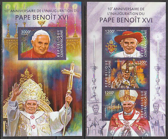 ЦАР 2015 год. Папа Римский Бенедикт XVI, малый лист + блок.
