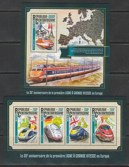 ЦАР 2016 год. 35 лет Высокоскоростным линиям железных дорог (LGV), малый лист + блок.