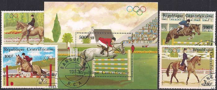 ЦАР (Центральноафриканская республика) 1983 год. Летние Олимпийские игры в Лос-Анджелесе. Конный спорт. 4 марки + блок (гашеные)