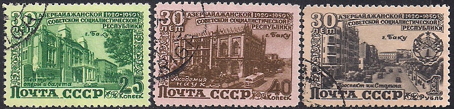 CCCР 1950 год. 30 лет Азербайджанской ССР. 3 гашеные марки