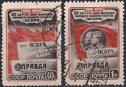 CCCР 1950 год. 50 лет выхода первого номера газеты "Искра". 2 гашеные марки