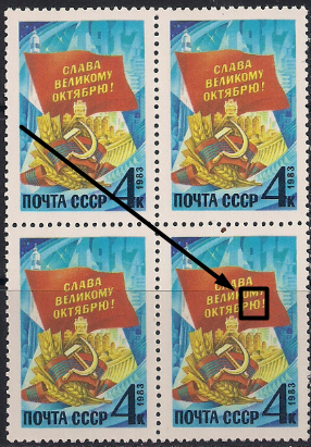 CCCР 1983 год. 66 лет Октябрьской социалистической революции. Квартблок. Разновидность - черта над "ю" в "октябрю"