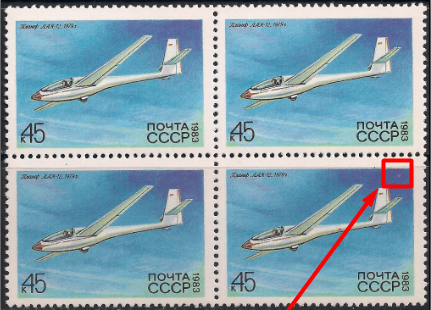CCCР 1983 год. Планер "Лак-12" (ном. 45 к). Квартблок. Разновидность - красный шар за хвостом