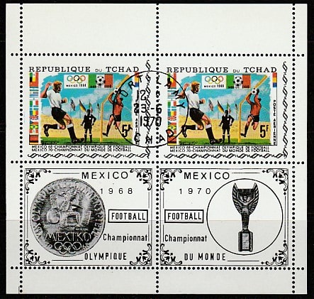 Чад 1970 год. Олимпийский футбол 1968 года и чемпионат мира по футболу в Мехико, малый лист (гашёный)