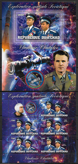 Чад 2013 г. Космос, Союз-4. В. Шаталов и П. Попович, блок и малый лист