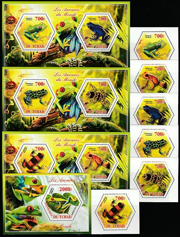 Чад 2014 год. Африканские лягушки, 3 малых листа + 7 блоков Сувенирный выпуск.