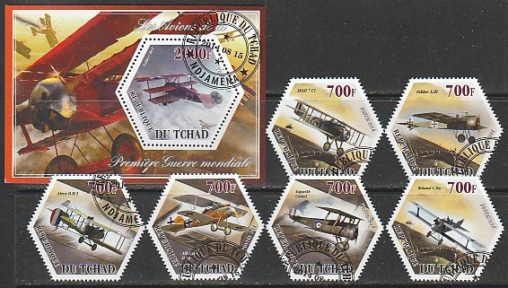 Чад 2014 год. Авиация I Мировой войны, 6 марок + блок (гашёные) Сувенирный выпуск.