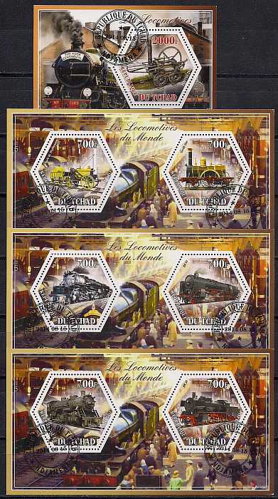 Чад 2014 год. Паровозы. 3 гашеных малых листа + блок Сувенирный выпуск