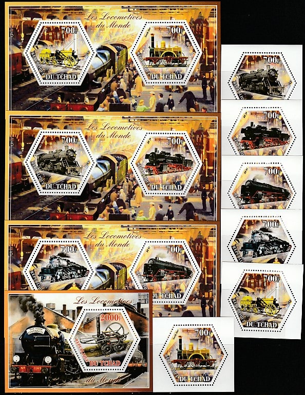 Чад 2014 год. Паровозы, 3 малых листа + 7 блоков