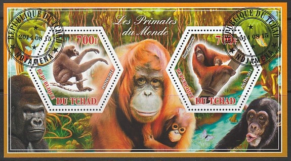 Чад 2014 год. Приматы, малый лист (I) (гашёный) Сувенирный выпуск.