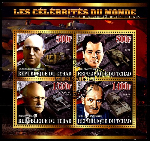 Чад 2015 год. Конструкторы танков (1). Гашеный малый лист Сувенирный выпуск