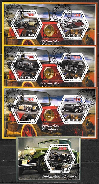 Чад 2015 год. Ретро автомобили, 4 гашеных блока