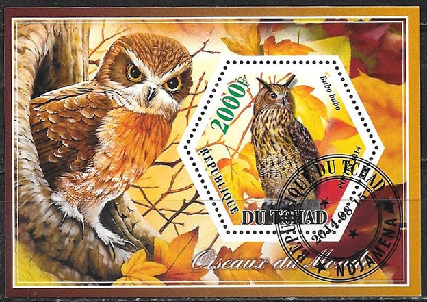 Чад 2015 год. Совы, 1 гашеный блок