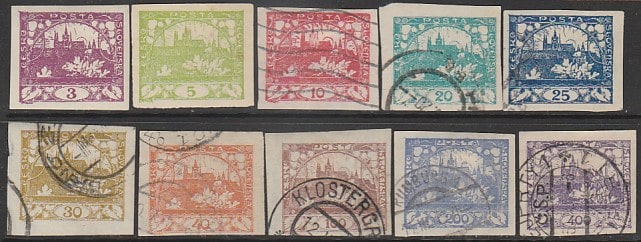 Чехословакия (ЧССР) 1918/1919 год. Стандарт. Пражские соборы, 10 б/зубц. марок (гашёные)