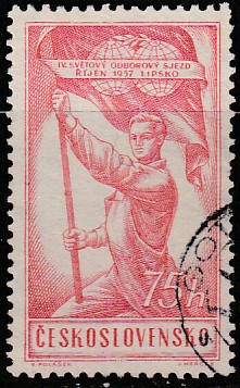 ЧССР 1957 год. IV Съезд профсоюзов. Рабочий с флагом, эмблема; 1 гашёная марка