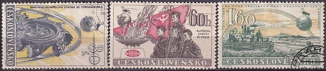 ЧССР 1958 год. 10 лет Февральским событиям 1948 года. Советские солдаты со знаменем. Сельскохозяйственные достижения ЧССР, 3 гашеных марки