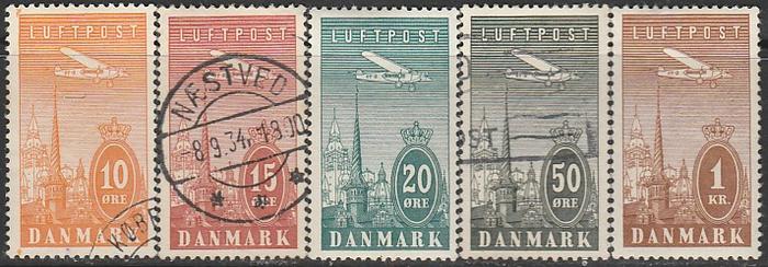 Дания 1934 год. Самолёт "Фоккер VII" над Копенгагеном, 5 гашёных марок